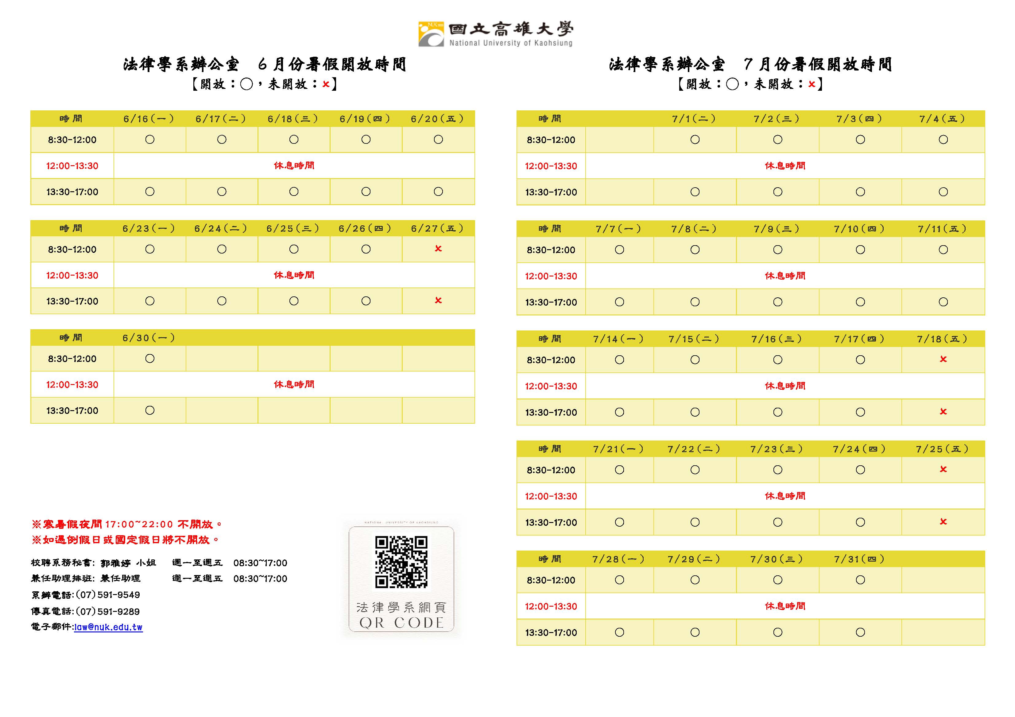 113-2 國立高雄大學法律學系辦公室 6-7月份開放時間.docx