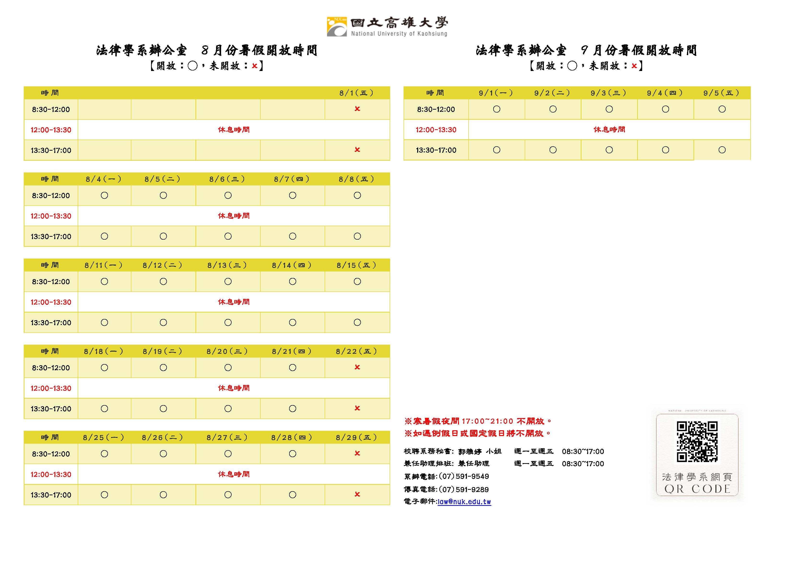 114-1 國立高雄大學法律學系辦公室 8-9月份開放時間.docx
