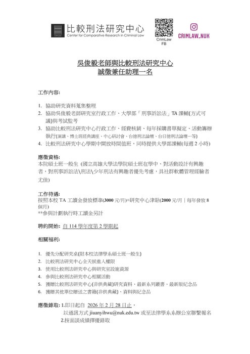 【徵求助理】吳俊毅老師與比較刑法研究中心誠徵兼任助理一名